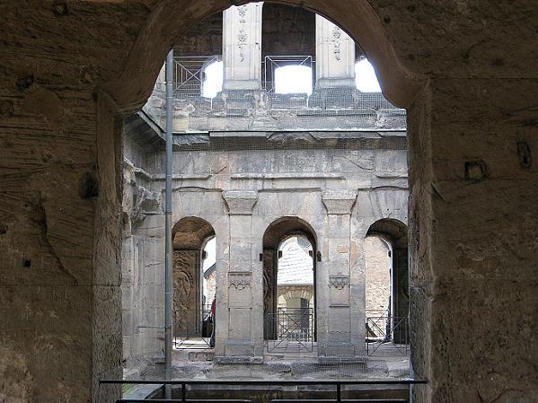 So the question remains why the Porta Nigra has never really been finished. That includes trying to find the exact date when it was built, which seems to be a bit of a puzzle for those archeologists. But there are a few hints. The gate is connected to the town walls, and among the rubble pottery shards from the second half of the second century AD have been found. That puts the date in the time of the reigns of Antoninus Pius (138 - 161; more likely the second half), Marcus Aurelius (161-180), Commodus (180 - 192) and maybe Septimius Severus (193 - 211; likely the first years). A few statistics have been calculated about the time it would have taken to erect the gate, but I'm prone to go for one of the longer estimates; governmental projects were never finished in time. I see Gabriele nods.